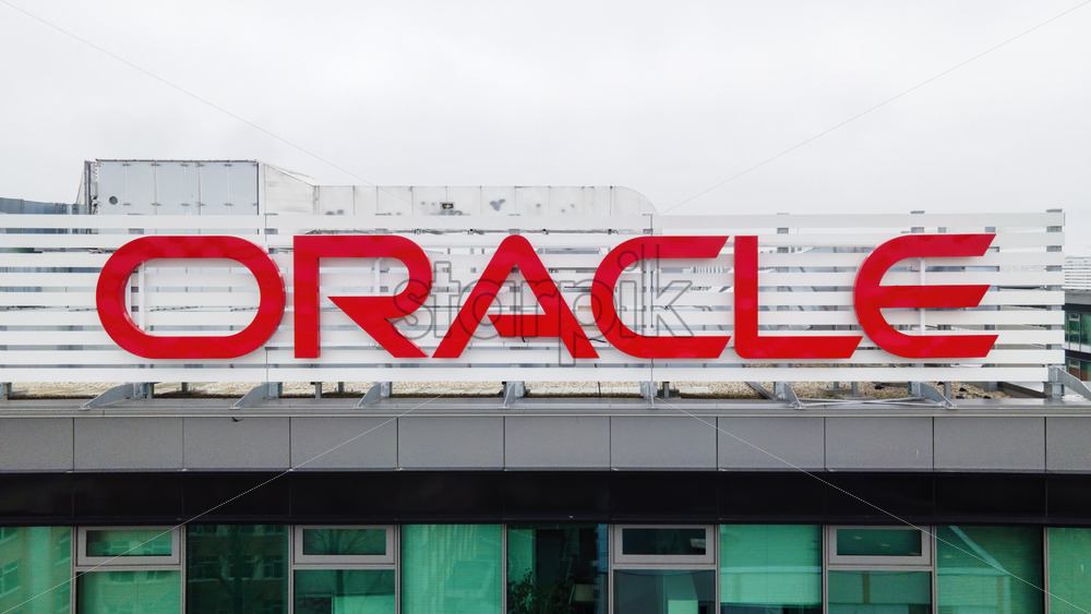 BUCHAREST, ROMANIA – 20 DECEMBER, 2020: Modern commercial office building with Oracle logo. View from the drone at cloudy weather