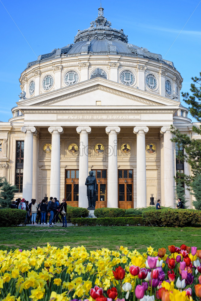 BUCHAREST, ROMANIA-22 APRIL, 2019: Romanian Atheneum, an important concert hall with tulip flowers