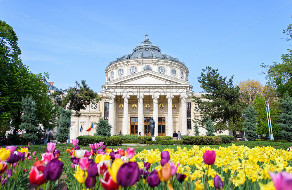 BUCHAREST, ROMANIA-22 APRIL, 2019: Romanian Atheneum, an important concert hall with tulip flowers