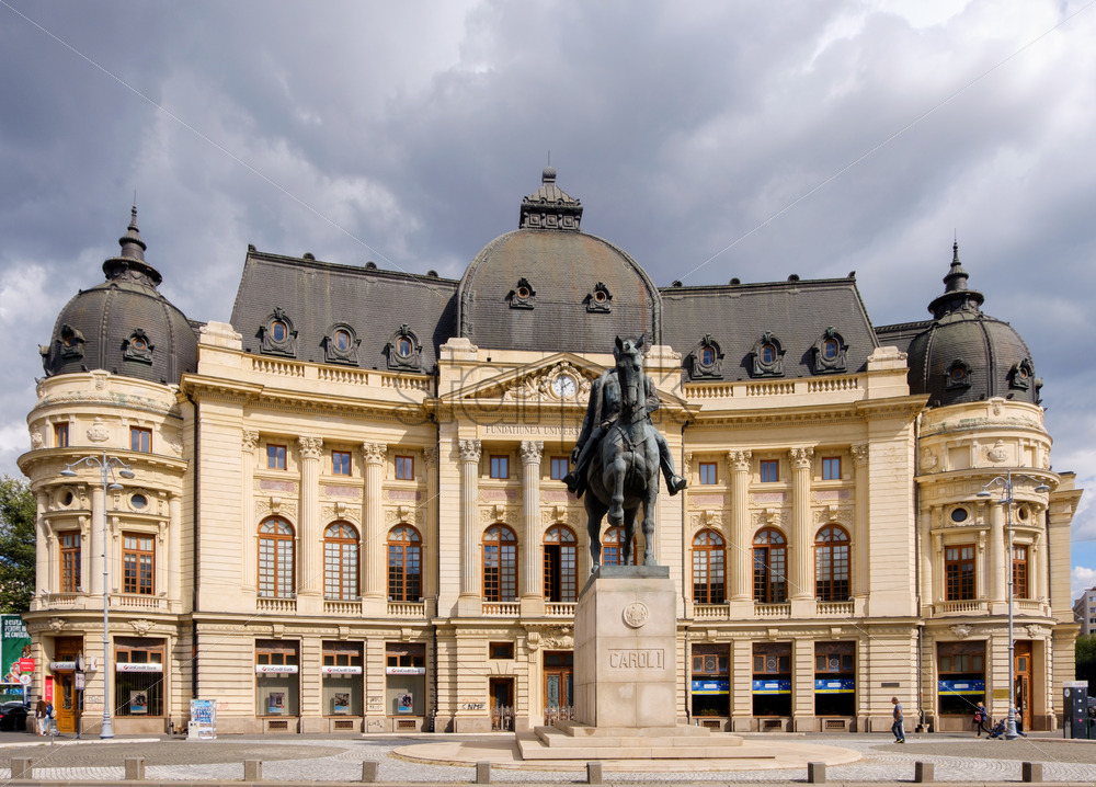 BUCHAREST, ROMANIA – 25 SEPTEMBER, 2018: facade of central university library and the monument of Carol I Royalty Free Stock photo