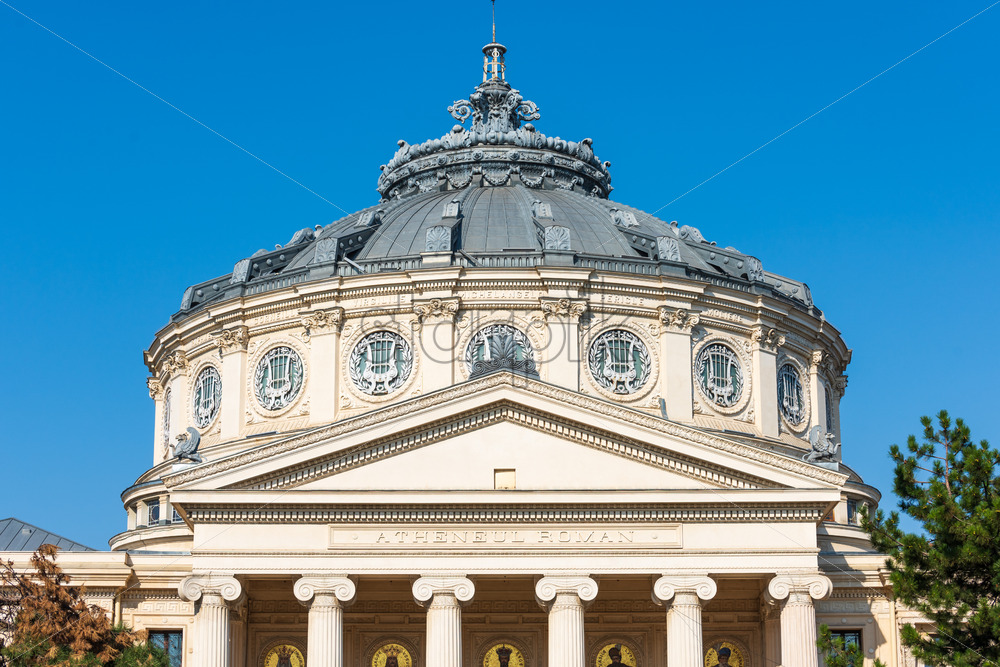 BUCHAREST, ROMANIA – AUGUST 19, 2019: Top facade of Romanian Athenaeum from the bottom view. Sunny day