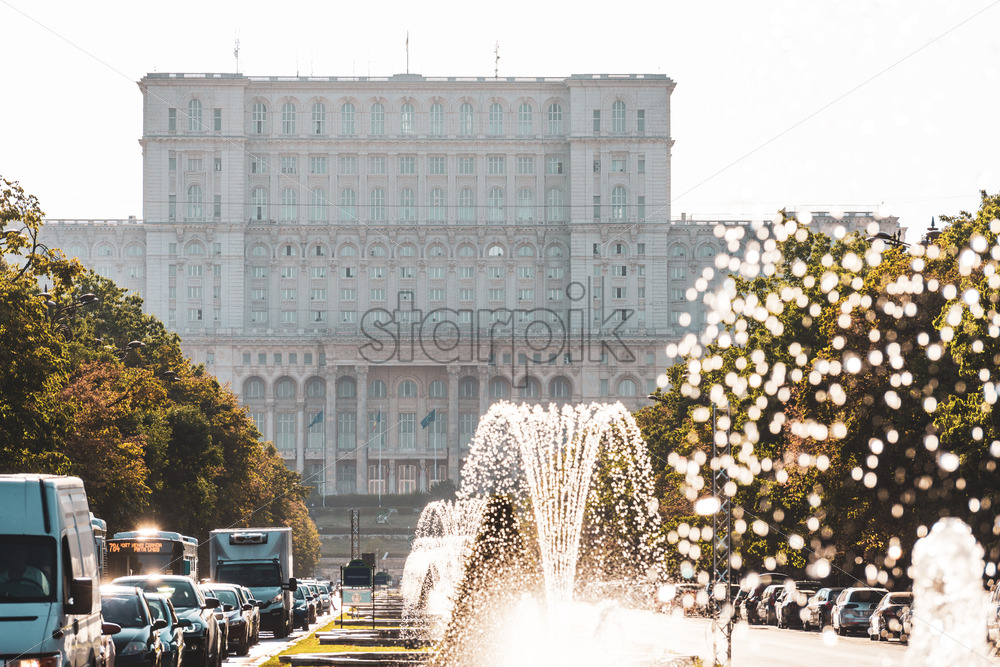 Home » Shop » buildings » BUCHAREST, ROMANIA – AUGUST 21, 2019: Working fountains on Union Boulevard in sunlight. The Palace of Parliament in background