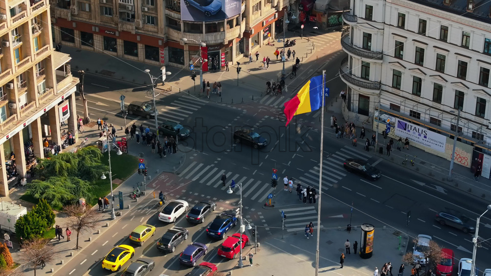 Bucharest, Romania – March 03, 2024: Aerial drone view of a downtown intersection with moving traffic and walking people in sunlight. Waving national flag Royalty Free Stock Video Footage