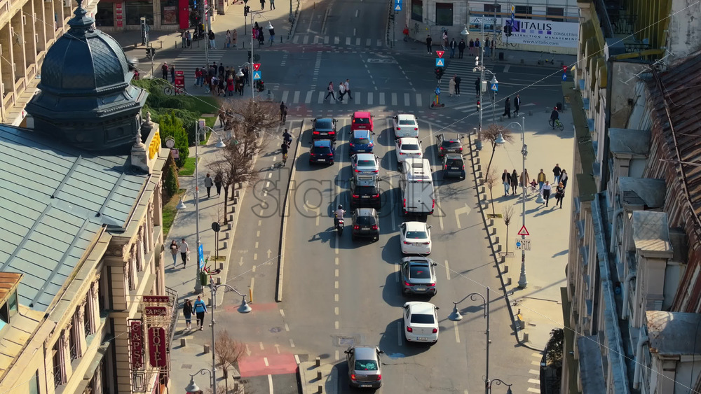Bucharest, Romania – March 03, 2024: Aerial drone view of a downtown intersection with moving traffic and walking people in sunlight Royalty Free Stock Video Footage
