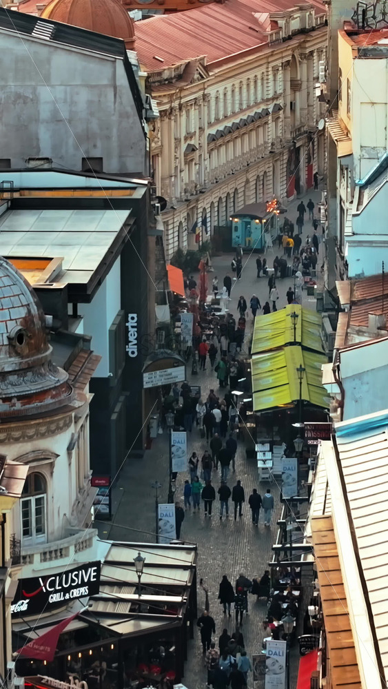 Home » Shop » 1 Video » Video – Bucharest, Romania – March 03, 2024: Vertical aerial drone view of walking people among old historical buildings and commercial shops in the old town