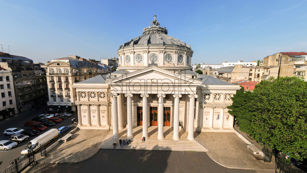 BUCHAREST, ROMANIA – MAY, 2022: Aerial drone panoramic view of Romanian Athenaeum. Main building with square in front of it, multiple buildings around, greenery, people
