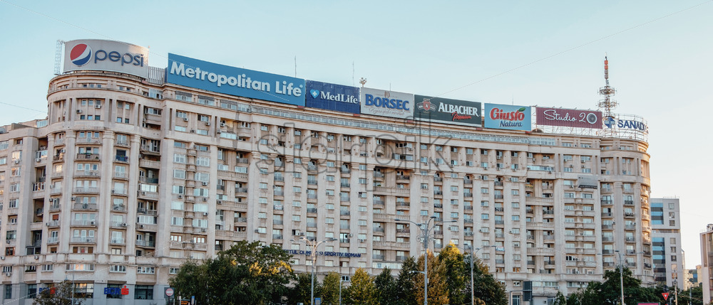 Home » Shop » photo » BUCHAREST, ROMANIA – OCTOBER 10, 2018: Cinematic wide view to a block of flats in Victoria Square center in Romania. Clear sky with no clouds. Big corporation ads on the building