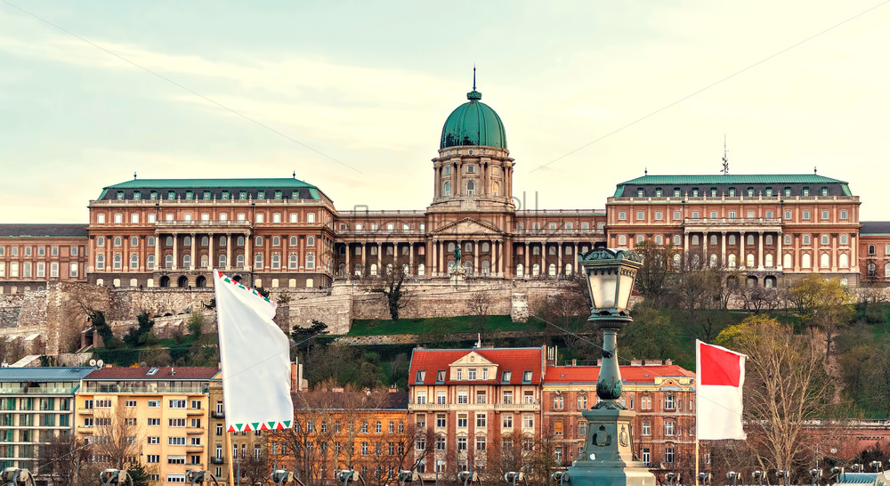Buda Castle at sunset with warm cloudy sky. City buildings on bottom. Negative copy space, place for text. Budapest, Hungary Royalty Free Stock photo