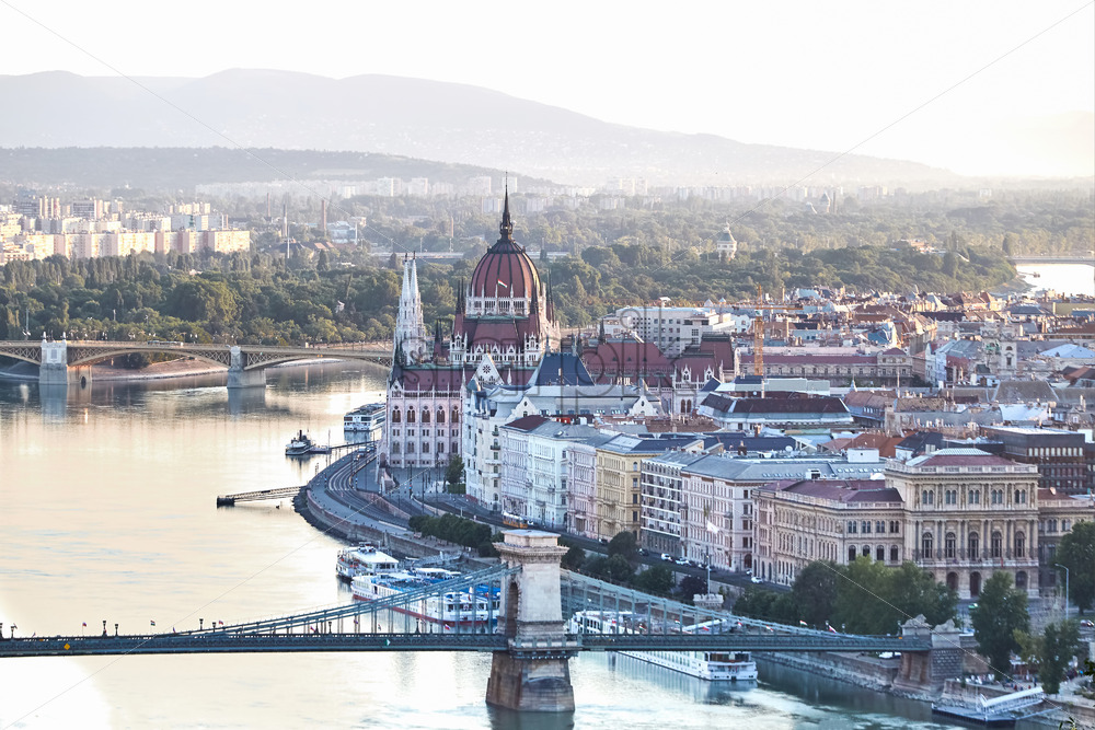 Cruise ships at sunset on Danube river. Warm sky reflecting on water. Famous parliament and city on background. Budapest, Hungary Royalty Free Stock photo