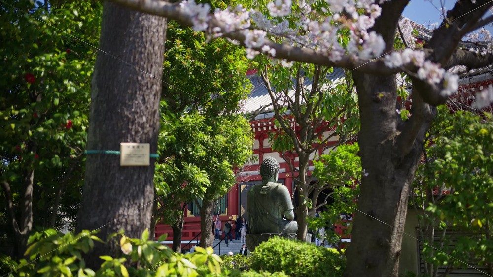 Buddhist sculpture surrounded by trees in Asakusa, Tokyo, Japan Royalty Free Stock Video Footage