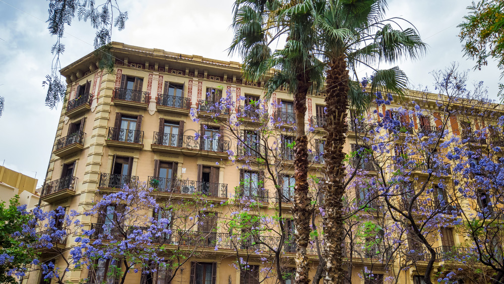 An old building made in classic style, flowers and palms in Barcelona, Spain