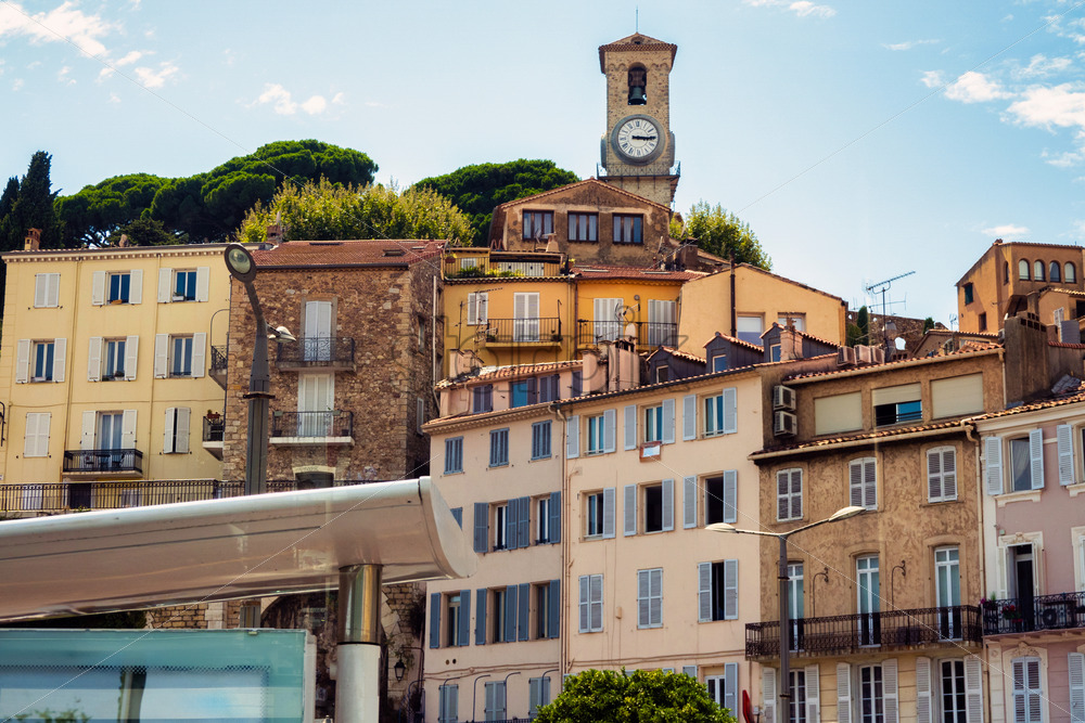 Buildings and castle tower with clock in Cannes, France, boats at the port