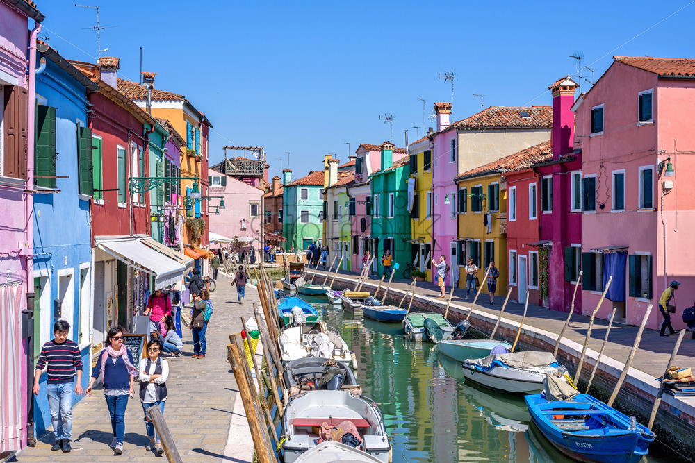 Home » Shop » photo » BURANO, ITALY – APRIL 03, 2017: Daylight view to a street with colorful buildings and people walking on sidewalk. Parked boats in canal and image reflecting on water. Bright blue sky