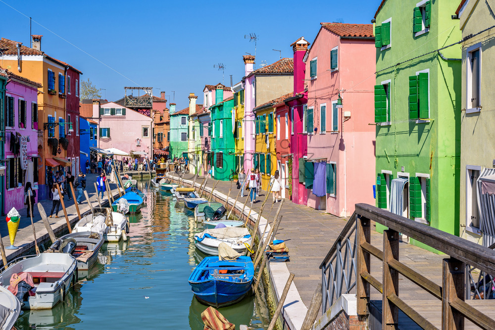 BURANO, ITALY – APRIL 03, 2017: Daylight view to a street with colorful buildings and people walking on sidewalk. Parked boats in canal and image reflecting on water Royalty Free Stock photo