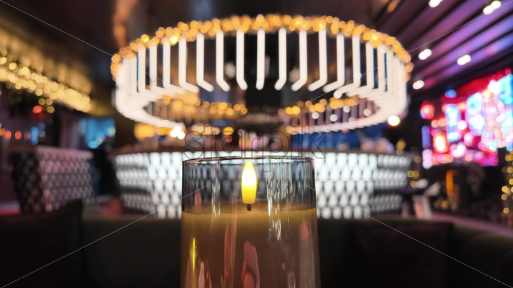 Burning electronic candle at a restaurant with neon lights and circles at Christmas Royalty Free Stock Video Footage