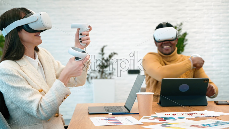 Business conference in VR in an office. A black man and caucasian woman using VR glasses and controllers, papers and gadgets on the table