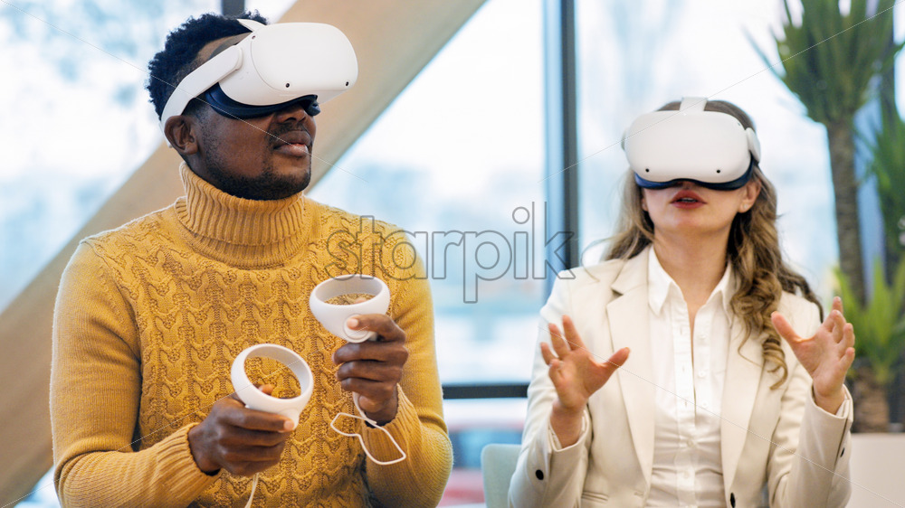 Business conference in VR in an office. A black man and caucasian woman using VR glasses and controllers