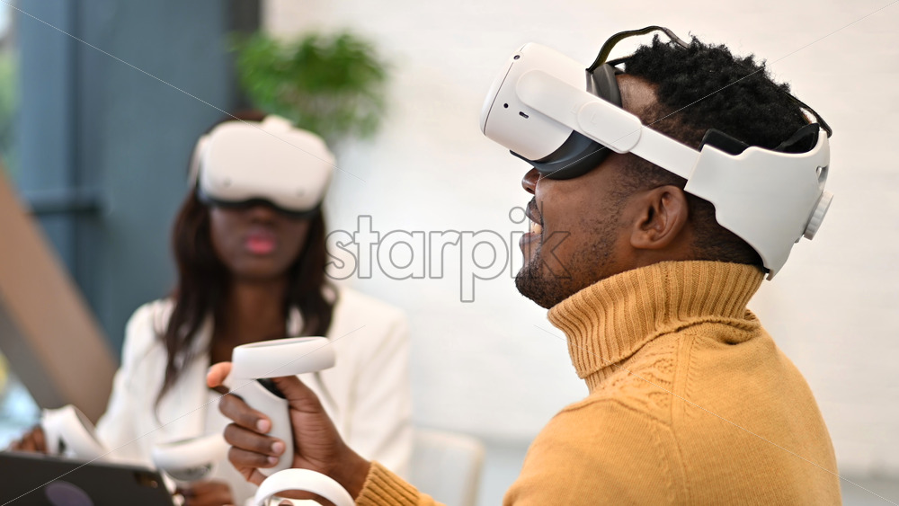 Business conference in VR in an office. A black man and woman using VR glasses and controllers