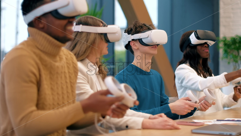 Business conference in VR in an office. Multiracial group of people using VR glasses and controllers, papers and gadgets on the table