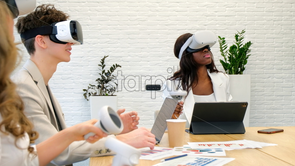 Business conference in VR in an office. A black man and caucasian woman using VR glasses and controllers, papers and gadgets on the table