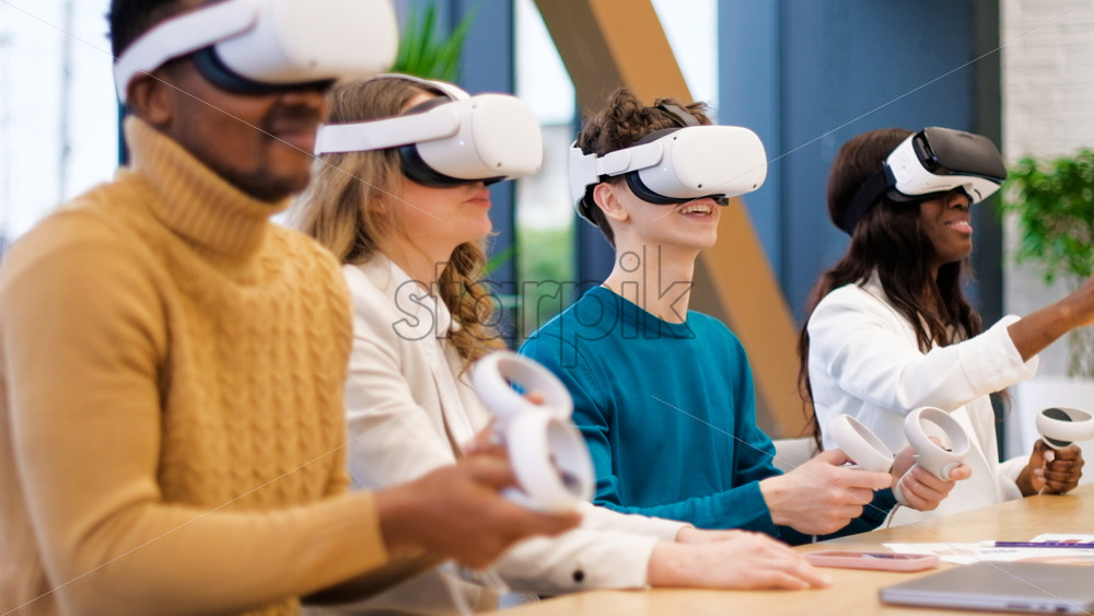 Business conference in VR in an office. Multiracial group of people using VR glasses and controllers, papers and gadgets on the table