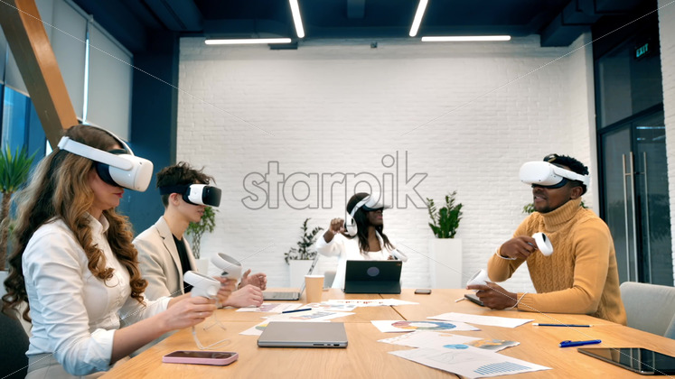 Business conference in VR in an office. Multiracial group of people using VR glasses and controllers, papers and gadgets on the table, virtual reality Royalty Free Stock Video Footage