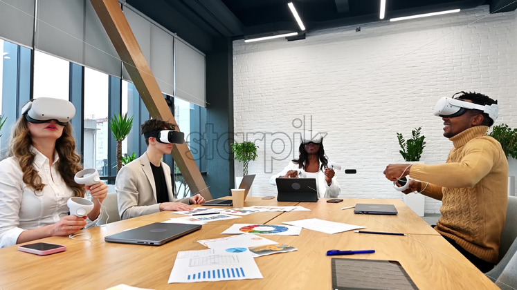 Business conference in VR in an office. Multiracial group of people using VR glasses and controllers, papers and gadgets on the table. Slow motion, virtual reality