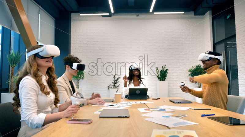 Business conference in VR in an office. Multiracial group of people using VR glasses and controllers, papers and gadgets on the table. Slow motion, virtual reality Download royalty free stock video footage Royalty Free Stock Video Footage