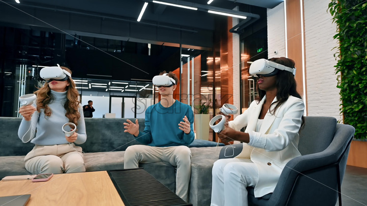 Business conference in VR in an office. Multiracial group of people using VR glasses and controllers