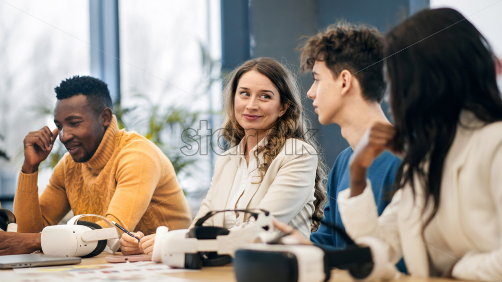 Business conference in VR in an office. Multiracial group of people, VR glasses and controllers on the table