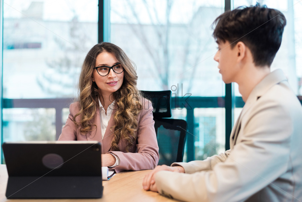 Business meeting in an office, female team leader and a young man discussing business affairs, gadgets and notebook on the table