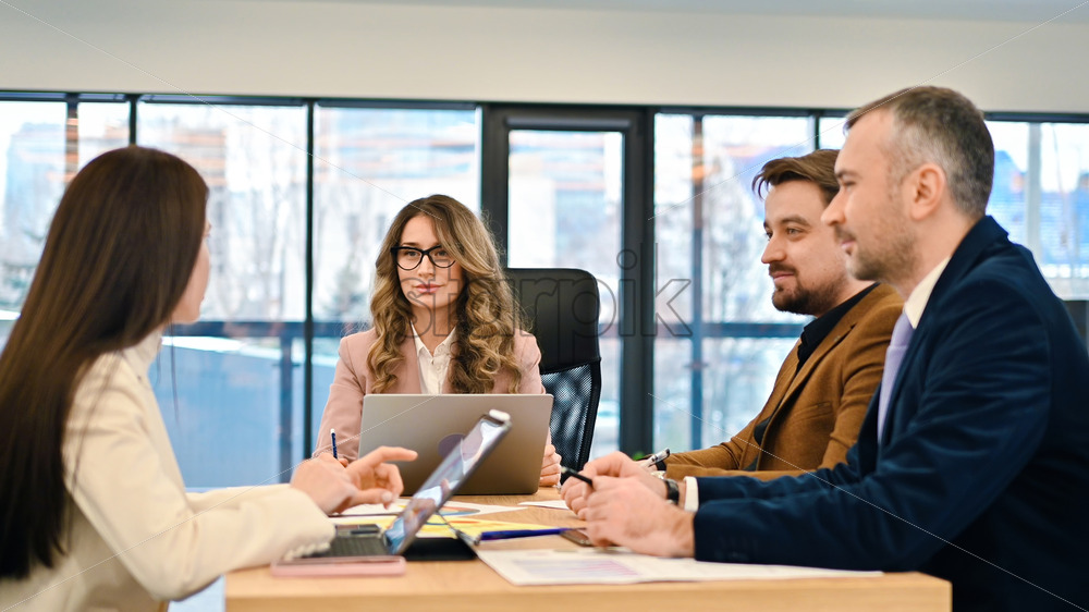 Home » Shop » photo » Business meeting in an office, workers discussing business affairs. Gadgets and papers on the table