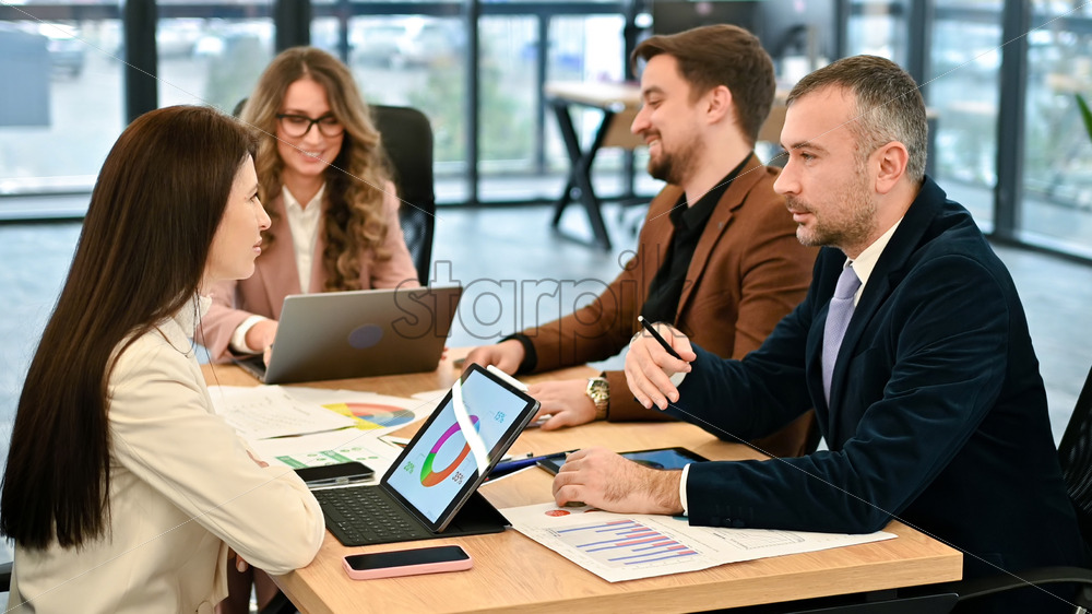 Home » Shop » photo » Business meeting in an office, workers discussing business affairs. Gadgets and papers with charts on the table