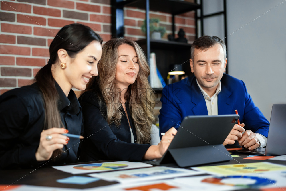 Business session in an office. Women and a man discussing business affairs. Gadgets and papers with graphs and notes