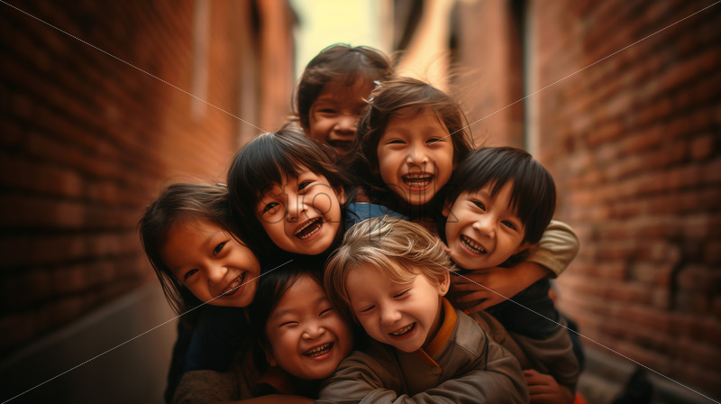Cambodian children laughing and enjoying their group hug in the street of cambodia while playing