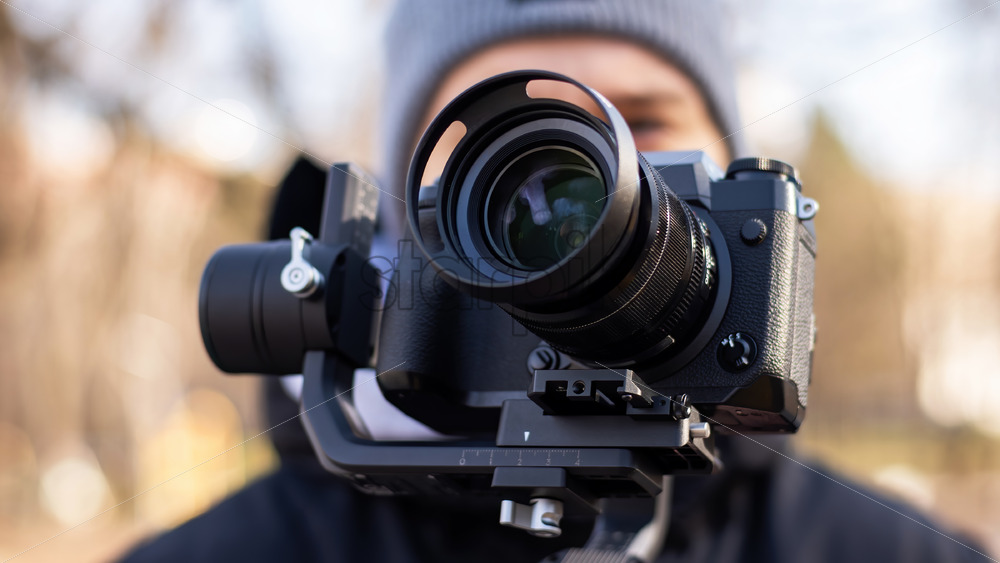 Home » Shop » photo » Cameraman with a camera on a steadicam. Winter, trees on the background