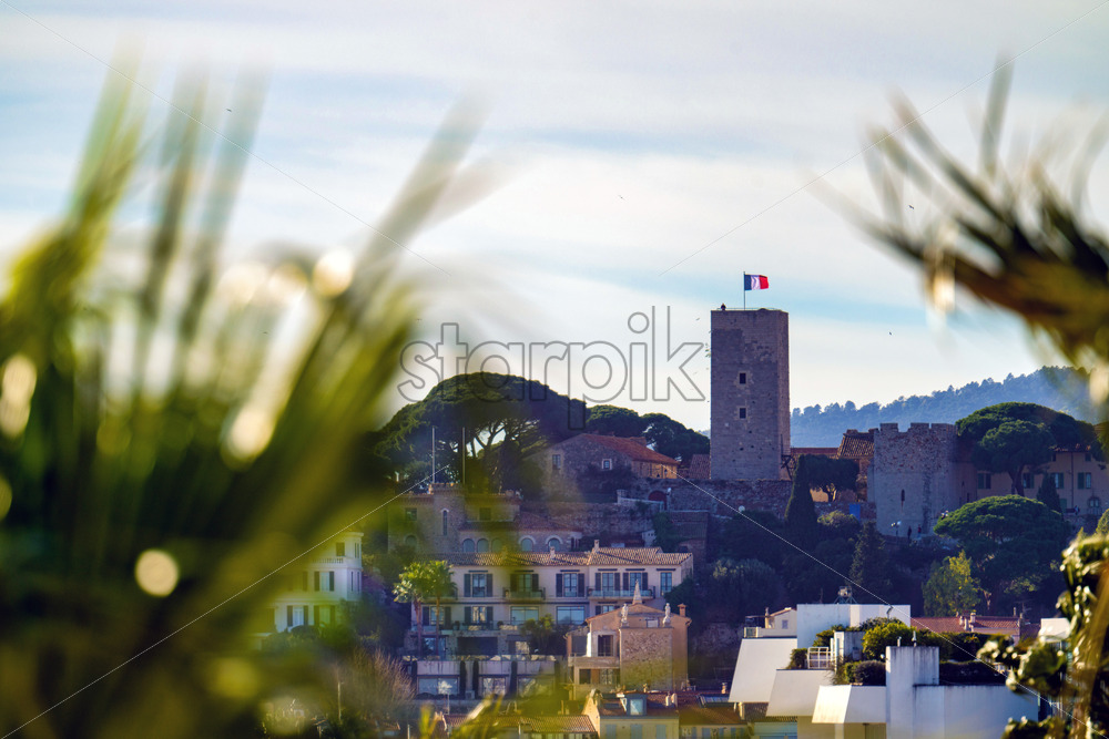 City town hall municipality buildings and castle tower with clock in Cannes, France