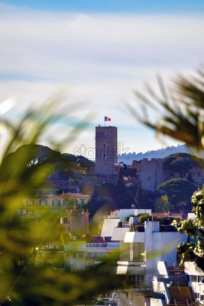 Home » Shop » AI Illustration » Cannes beach and castle, buildings and palm trees, France