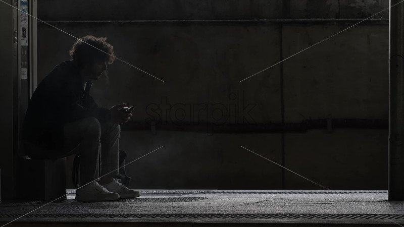 Cannes, France – Aprile 20, 2022: Man smoking electronic cigarettes with big smoke at train station Royalty Free Stock Video Footage