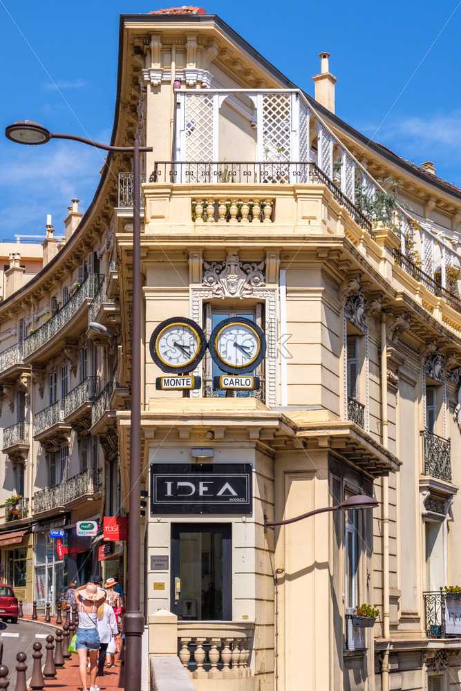 CANNES, FRANCE – AUGUST 07, 2018: Idea clocks creature on streets of Monte Carlo. People on promenade at daylight
