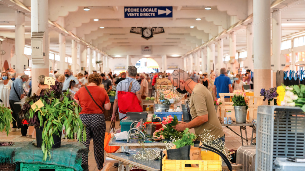 CANNES, FRANCE – AUGUST 28, 2021: View of full of people market pavilion, illumination