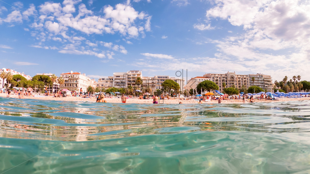 CANNES, FRANCE – AUGUST 31, 2021: View of a beach with resting people, view from the surface of the water, Mediterranean sea