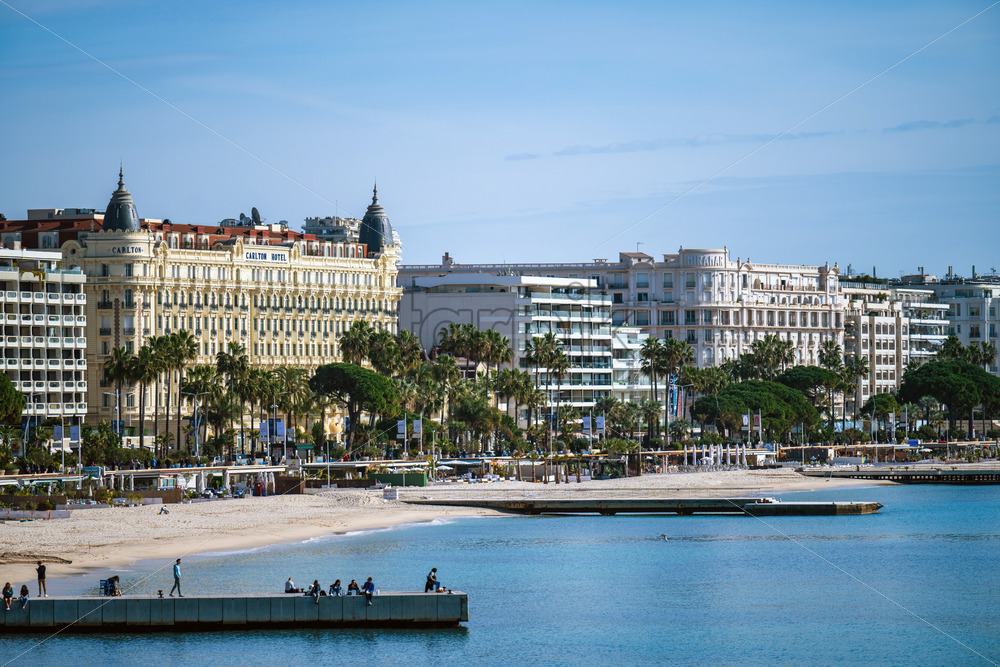 Cannes, France – September 6, 2025: Aerial drone view of the sandy beach with umbrellas, sunbathers, and swimmers in turquoise sea Royalty Free Stock Video Footage