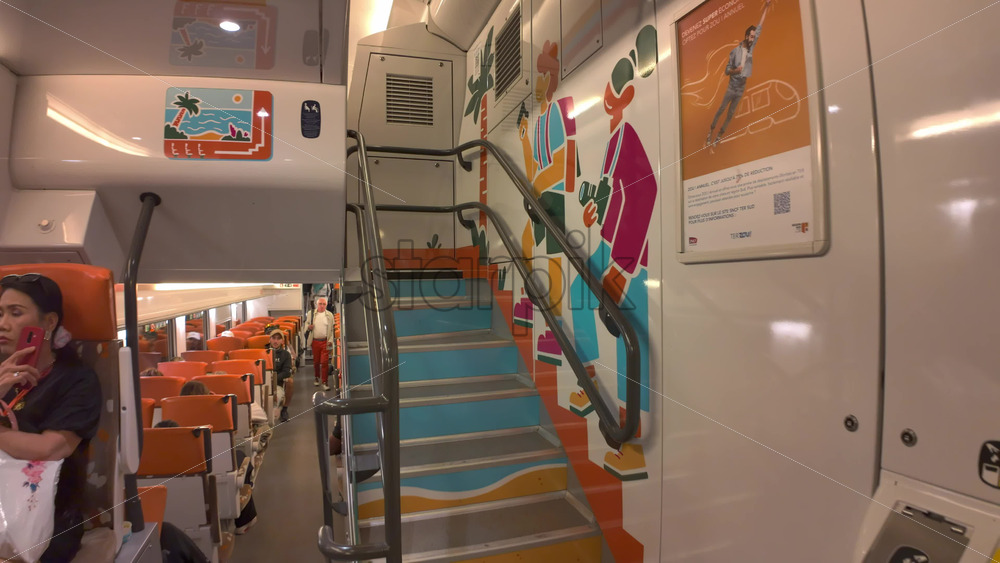 Cannes, France – July 10, 2025: Passengers seated on orange seats in the regional train Royalty Free Stock Video Footage