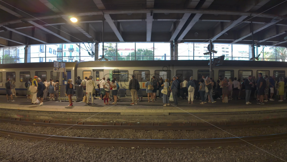 Cannes, France – July 10, 2025: Passengers waiting as regional train pulls through a covered station platform Royalty Free Stock Video Footage