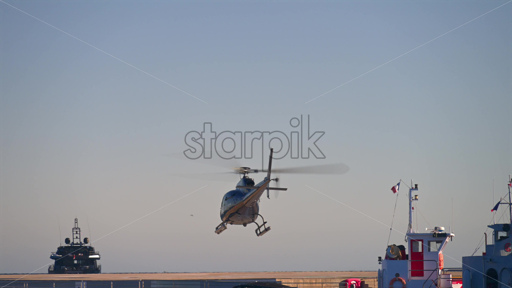 Cannes, France – June 22, 2025: A black helicopter flying low above a dock with boats moored nearby under bright daylight Royalty Free Stock Video Footage