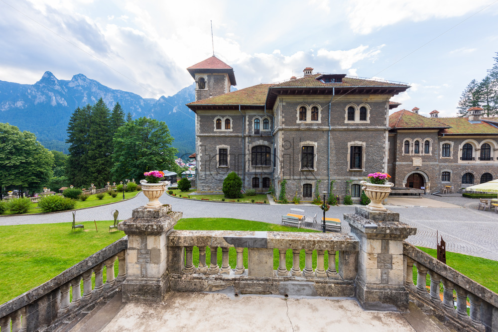 Cantacuzino Castle in Busteni city in daylight. Lateral shot of the building. Bottom view. Distance shot with baluster in foreground Royalty Free Stock photo