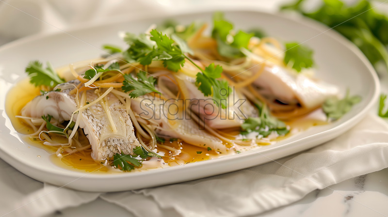 Cantonese style steamed fish on a white platter, garnished with ginger slices and fresh cilantro.
