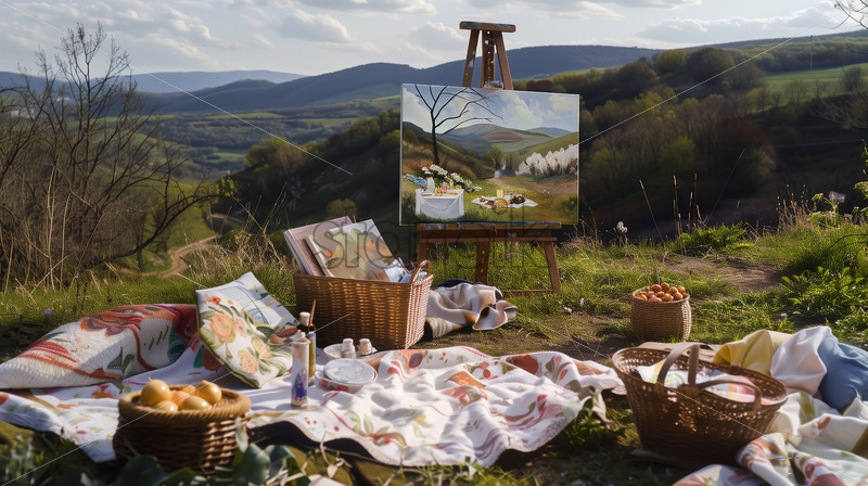 An artist capturing the scenic beauty of a picnic spot on canvas, surrounded by blankets, baskets, and the natural landscape.