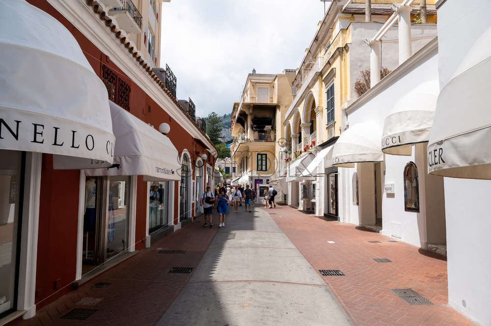 CAPRI, ITALY – JUNE, 2022: Street scape of the town. Narrow street with walking people and luxury stores